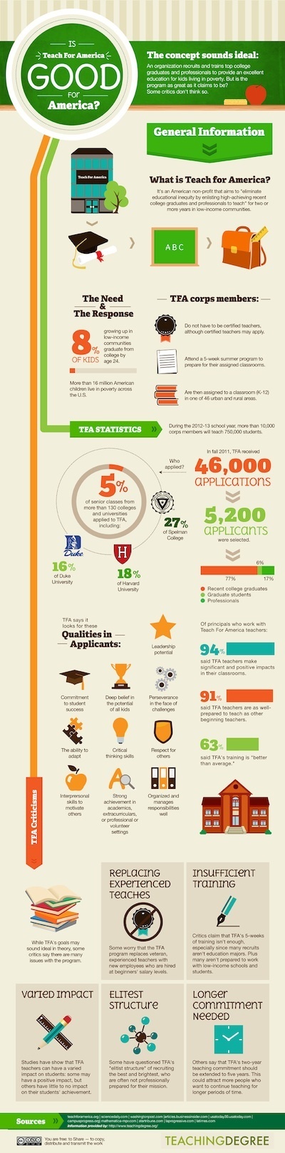 The concept sounds ideal: An organization recruits and trains top college graduates and professionals to provide an excellent education for kids living in poverty. But is the program as great as it claims to be? The answer is not as clear as you might think. Please take a look at this infographic on Teach for America.