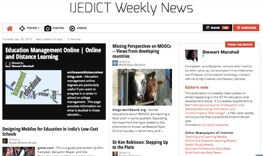 "IJEDICT Weekly News", by Stewart Marshall: A free, online newspaper with a curated selection of articles, blog posts, videos and photos about using ICT for education and development.